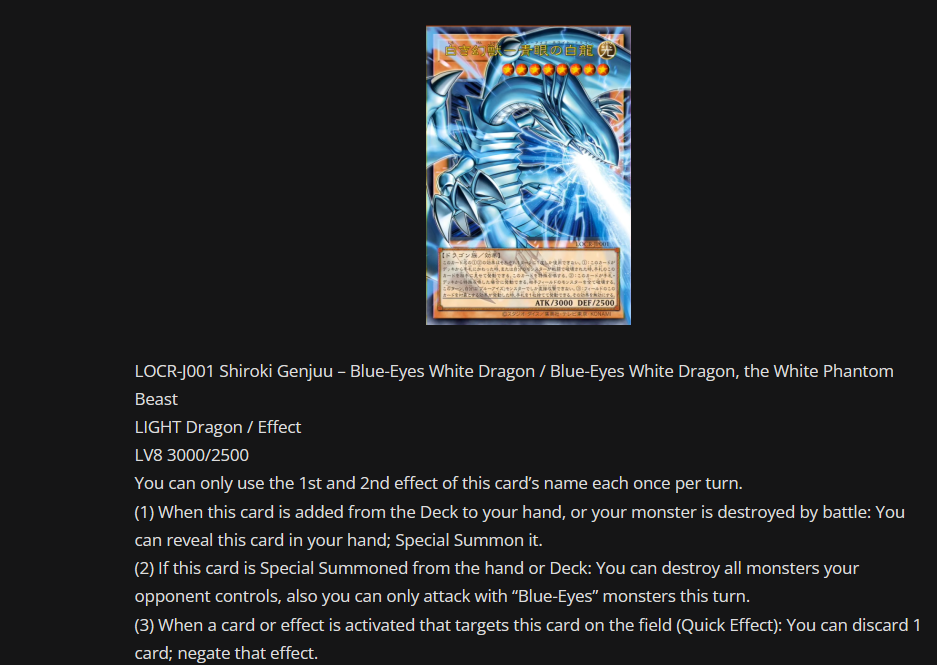 >>728911910Yeah. Blue-Eyes is stuck as a one trick pony that's trying to end on Spirit Ultimate, Sifr, and either a final Spirit Dragon or Magia.>>728911930Nah. It's pretty easy to disrupt since even going first it has a really heavy choke point in Spirit with Eyes of Blue. It has Primite but it doesn't do anything but get you access to a vanilla BE with drillbeam ready if you don't have either sage or maiden in hand already.