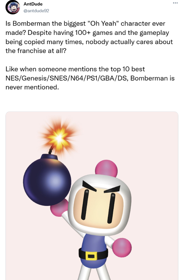 >>728938257Bombermanfags are delusional and think he’s an A-list vidya character along the likes of Mario, Sonic, Mega Man and Pacman. They rightfully deserve to get ridiculed over their obsession over a C-list character who got BTFO by superior franchises in his peak.Hudson Soft went defunct twice, he's a nobody.