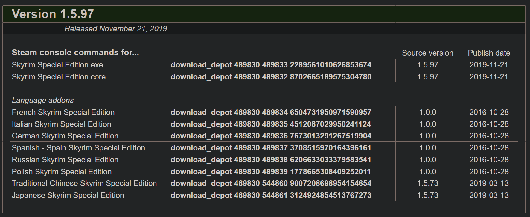 >>728933579As long as you're on steam, you can download depots for older versions of the game. 1.5.97 is the last SE version before creation club shit was added, here's the codes if you want them. All this is doing is downloading a different (older) version of the game steam keeps archived. You'll need to open the console on steam to plug this in but after that it's just wait for it to download normally and then suspend updates for Skyrim.