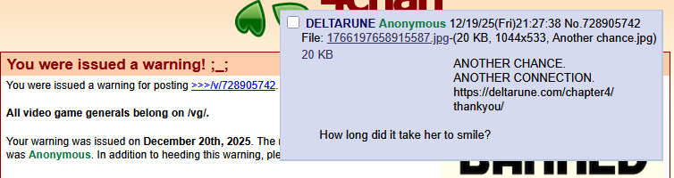https://deltarune.com/chapter4/thankyou/>the clock on the wall shows it's 3pm at the time of the rape>the music that plays in the church lobby (where you can think of noelle and hear the "thank you" scene) is called "12am" >it took 9 hours for her to smileSomebody put this in because I already wasted my vote