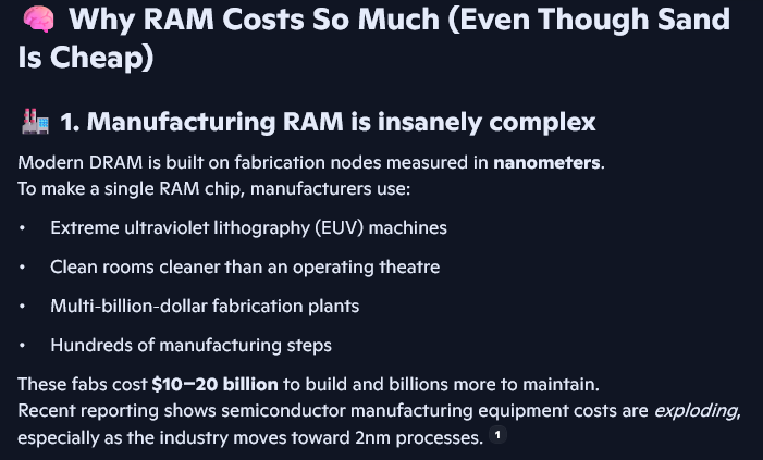 >>728943115Requires high end machining parts and a cleanroom.And the average gamer can't even clean their room, let alone get one that has literally ZERO dust, dirt, debris, or microparticles of anything which could potentially contaminate the parts needed to make said RAM chips.