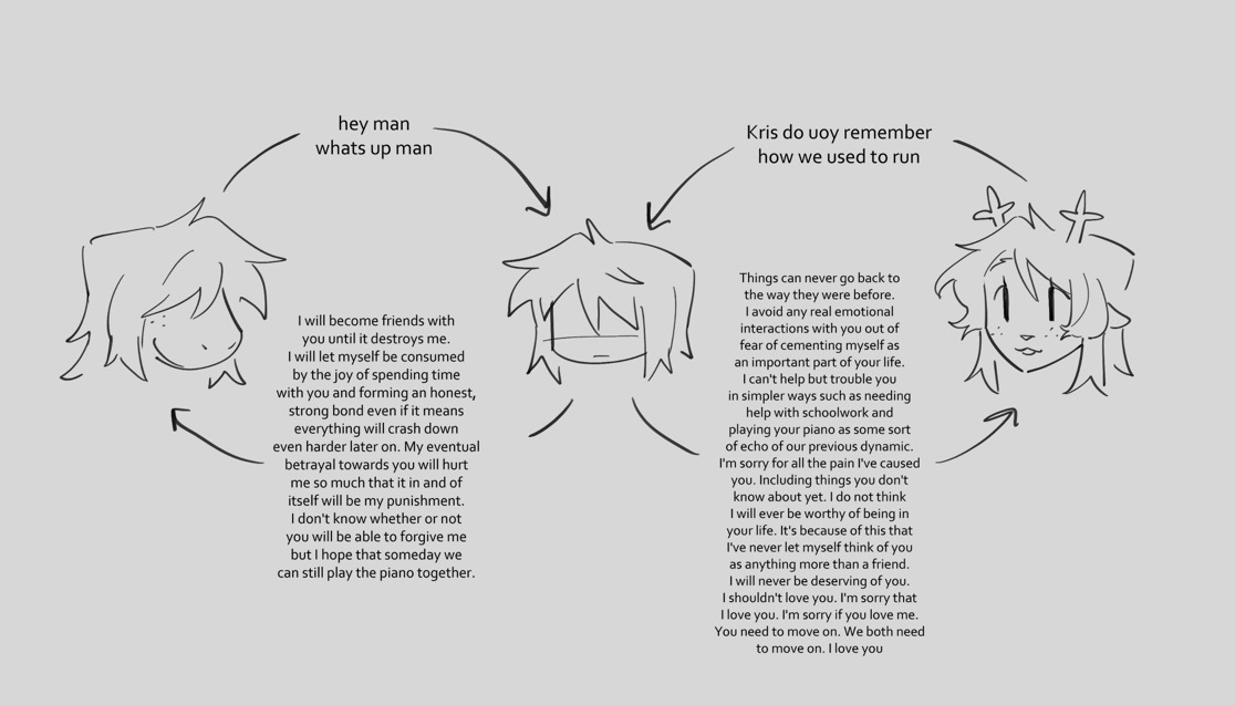 >>728959629nta but i thought since ch1 that kris was clearly supposed to be the deltarune equivalent to charasame adopted family, same fondness of sweets, same fascination with knives the biggest difference is that kris didn't have this tragic backstory that made him become a misanthropist instead the tragic backstory involved losing someone close to him through unspecified means and emotionally closing herself off from everyone (except for asriel, maybe)obviously they're not the same character, but they do parallel each other a fair bit