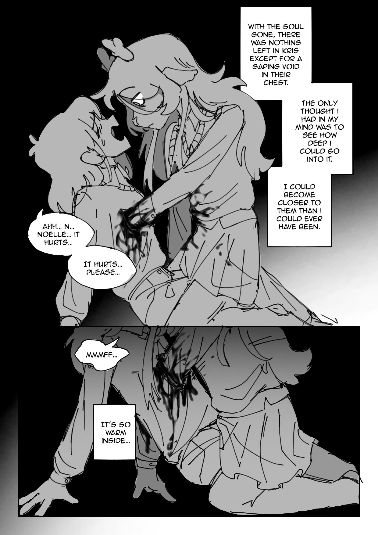>>728959637>that the bloodstain is already by the cage in Kris's room before we arrive.>It would seem to imply that Kris was already ripping out their soulThat's not what happens when they rip the SOUL out though. Kris is obviously not physically punching a hole through their chest and ripping out their organs, they can just magically reach inside and pull the SOUL out somehow, it's clearly painful but doesn't leave physical traces like splattering blood everywhere.