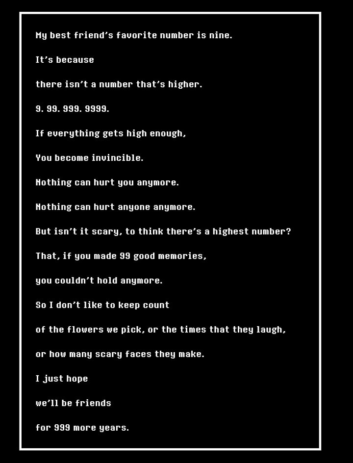 >>728986973>The Throne of the Godsprobably just a dumb bit>deltarune.com/chair/Foreshadowing the cutscene at the start of Chapter 3 where Ralsei explains how Dark Worlds work.>You see, when it gets dark... Things become more indistinct.>A chair can look like a monster. A poster can look like it's moving.>Your eyes can't see the truth anymore.We just see the chair get covered in darkness with other things in Susie's room like the poster, before it completely fades to black and the scene continuesFRIEND appears later in the scene, with its face manifesting on this shadowy creature that looks like Endogeny, the dog Amalgamate from Undertale. This part of the scene is completely surreal with no obvious connection to anything in the Light World before it.FRIEND is almost certainly not just a Darkner, given that it's implied to have somehow led Kris and Dess astray in the Light World.>>Fortune from the gacha machine in Chapter 3>* (Don't let your guard down. That chair is going to kick your ass!)The other fortunes are hints and foreshadowing related to Chapter 3, so this one stands out. This and the jumpscare in the Spamton Sweepstakes was probably the main source of "FRIEND is the chair" ideas, but like I said, the idea that FRIEND is just a Darkner of a chair in Susie's room really doesn't make any sense with everything else that we know about it.It's still not clear what it means though. Maybe it's a reference to something outside of the game, maybe it was cut content from the City board, maybe it's something that we haven't seen yet.
