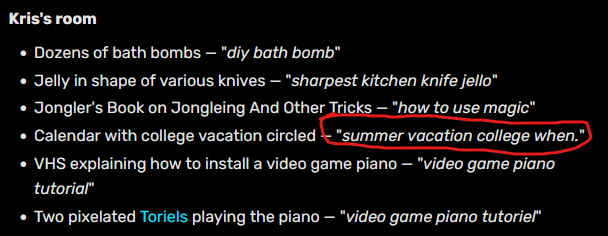 >>728959637noelle almost immediately noticed that kris is acting strange in ch1 when they're talking at the end of the chapterbased on that i assume that kris being possessed is a fairly recent development, even if they've grown distant noelle still can pretty quickly pick of when kris is acting weirdthe bloodstain might've only been a day or two old in ch1, and the birdcage was clearly something just to house (you) when kris wants a break/ is doing shit he doesn't want (you) to know aboutthe real question is why toriel didn't notice it when susie did instantly