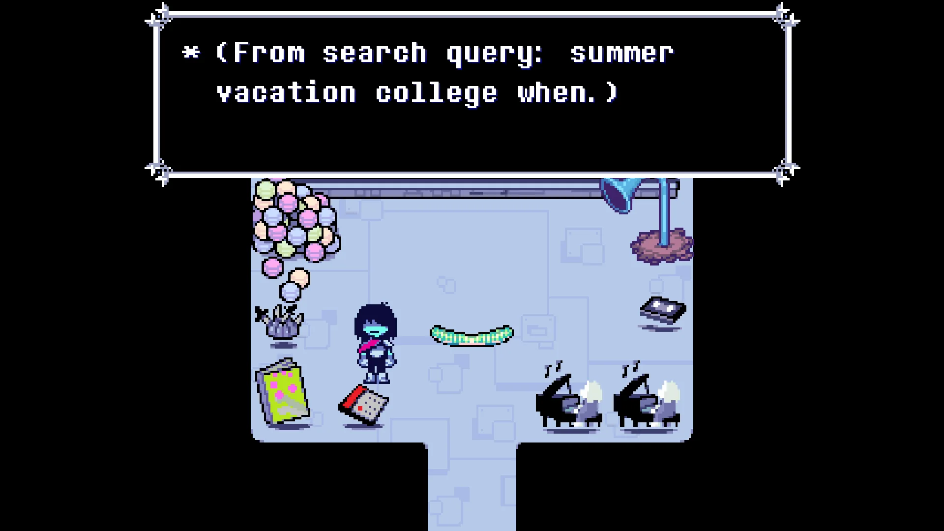 >>728985196>"Ooh... Kris this paper is blank....">"Y-You must have used invisible ink, right? ...Or maybe Susie ate it?">"I-I know you wouldn't forget... I can give you an uh... C- for effort!"
