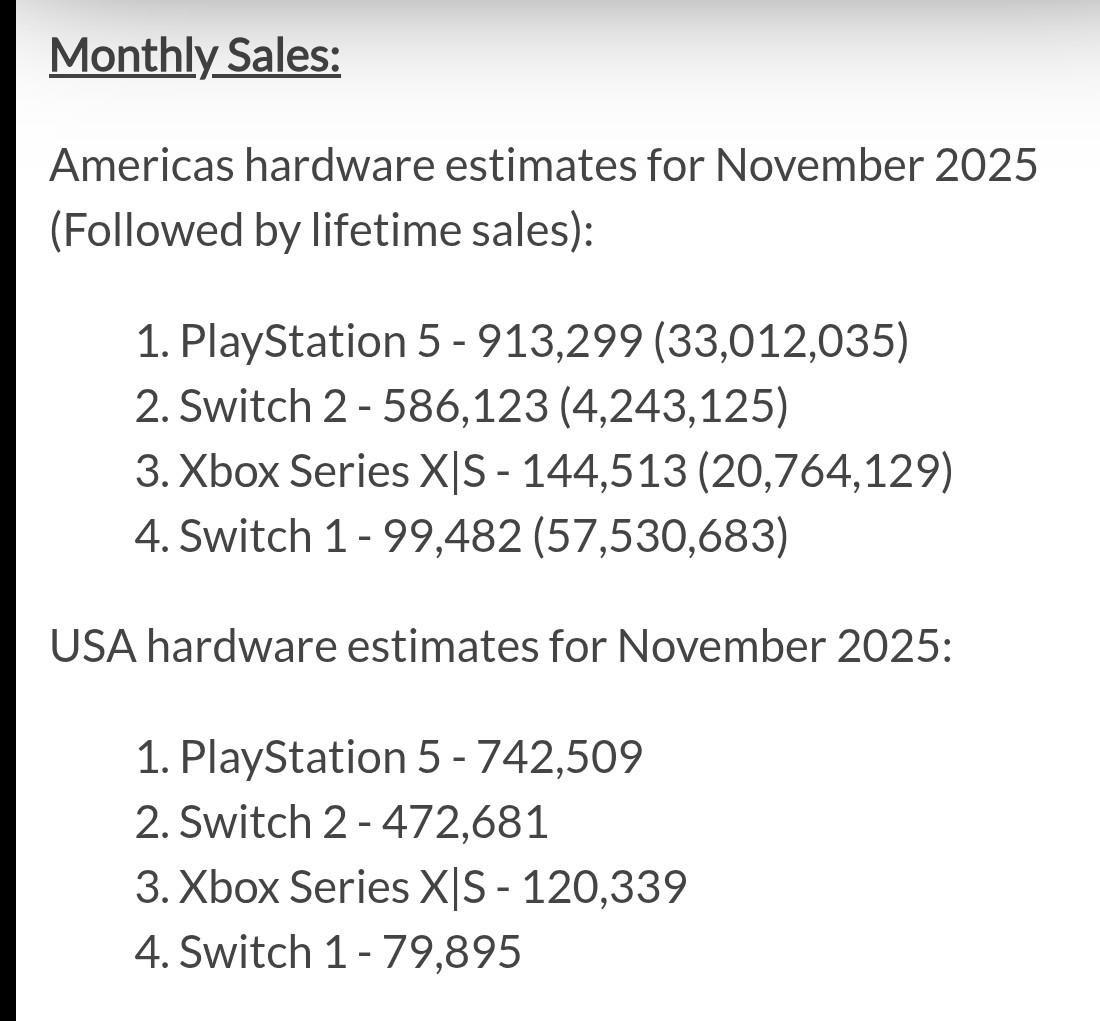 >>728990123>>sold 1/3 compared to PS5 during black friday, despite PS5 already having sold 90M+ unitsThe Switch 1 getting outsold by the fucking Xbone on Black Friday 2017 and that was with BotW and Odyssey out.