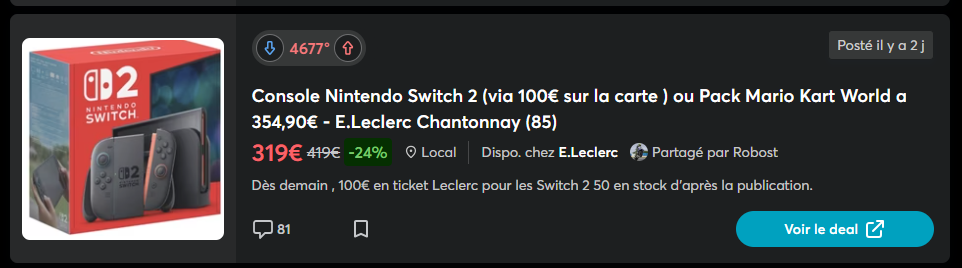 >>728996479This is less about the "Switch 2 flopping" and more the french superrmarkets (Auchan, Leclerc, Carrefour, etc.) being usually highly competitive against each other. Nevermind during holiday periods.Of course, I don't think global shitposters care the slightest about context.
