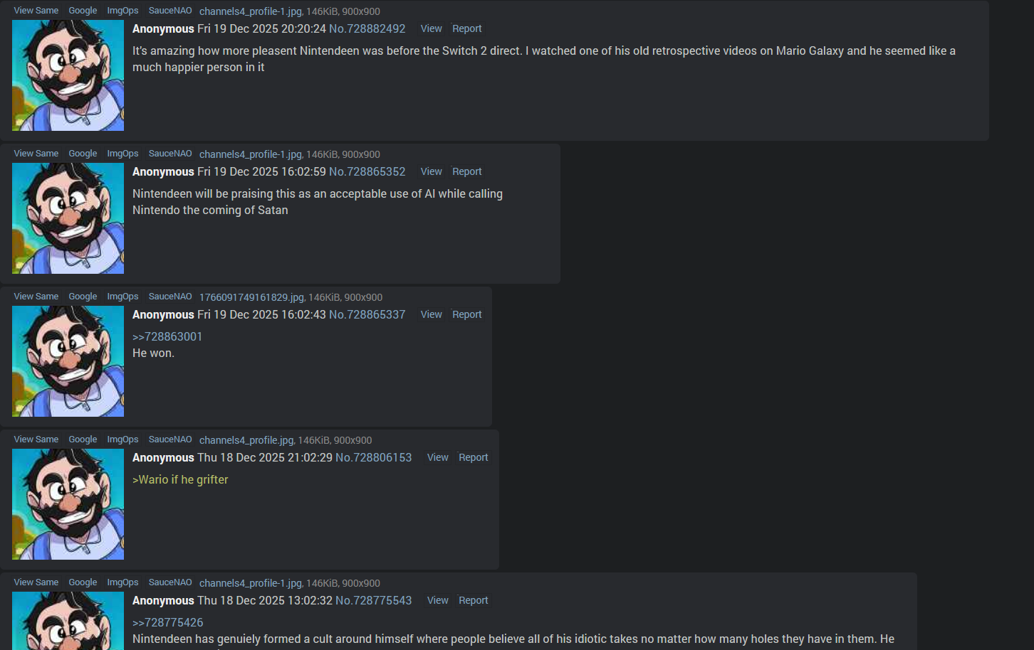 >>729024767You're not really adding context, you're just making yourself look extremely untrustworthy.>>729025135>they kind of are with how they get presented, especially when the OP pic isof Kirby with the 3 other platforms beind dead around him and all the bot comments that fall into the thread within seconds of it being made.Not at all. In fact they serve to prove the point because the first Famitsu thread of the week never has that, it's always the following ones and the following threads are never made by the op of the original.In fact they're made explicitly to get the threads banned for console warring which did work at one point, they were banned here and moved to /biz/ until the /biz/ mod put the /v/ mod allowing the anti-Nintendo shitposting to run rampant in his place returning the threads to here.You don't seem to understand how irrationally angry these people get just because Nintendo is doing well.