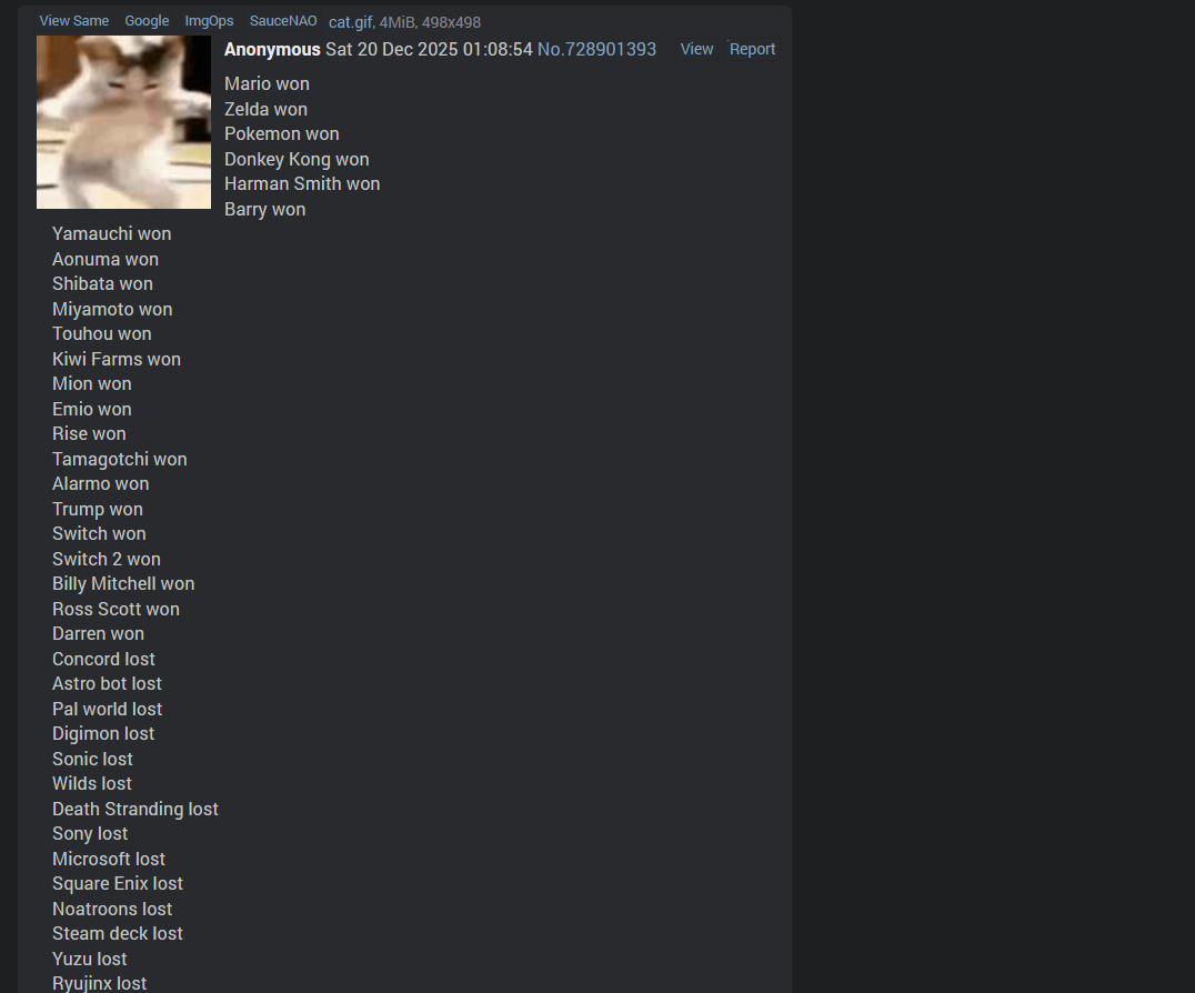 >>728989607You decided to ignore every other Switch 2 game, be exclusives or not, out of pure dishonesty so your point is essentially moot.I don't disagree that the PS2 was a monster with a big amount of games, but that was also a different time when western games didn't suck balls as they usually do now, game budgets weren't inflated into bloated numbers for graphics (thus contributing to less experimental projects), and certain companies weren't firing/dropping their employees on the spot instead of cultivating a culture where old veterans would teach newbies.>>728987024>"Desperate Nintendo" eras are the WORST timesI would say they're the worst time if you enjoy videogames, period. I find funny how certain individuals are trying to paint Iwata in a good light when the guy allowed amiboo figurines to lock away actual gameplay content during the 3DS and WiiU era.And the sole real 'anti-consumer' practices Nintendo has done recently were the removal of the gold points and coupons on the Eshop.