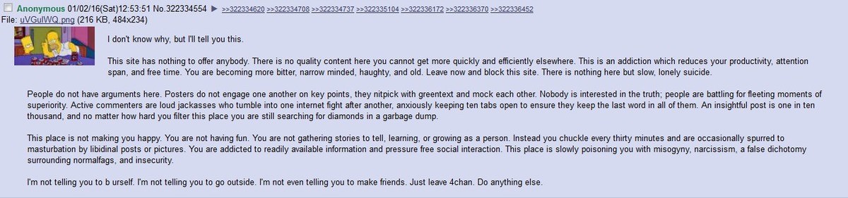 >>728991934I've spent a lot less time playing vidya/watching anime than most people here due to OCD and other mental difficulties, so I've spent the vast majority of my free time scrolling through social media and occasionally watching things on YouTube. It's probably the worst way you could possibly spend your time aside from, like, drugs or some shit. I still browse 4chan for hours every day and it's completely miserable 99% of the time. I only do it because doing the stuff I actually want to do is stressful and exhausting for me at this point. I'm trying to make it a point to spend my time more wisely moving forward but it's still an immense struggle for me. People don't really understand the type of destructive capabilities that social media addiction can have, it's completely life-ruining.Pic related.