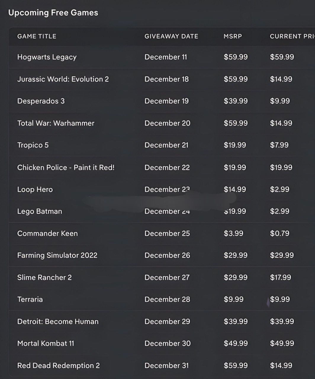 >>729008665this list has been proven fake every fucking timethis is the worst december give away by epic in a while, all these games are literal whos games that realistically should be 5 dollars each anywayi think even epic knows that it cant even pay people to play on its platform anymore and has just given up