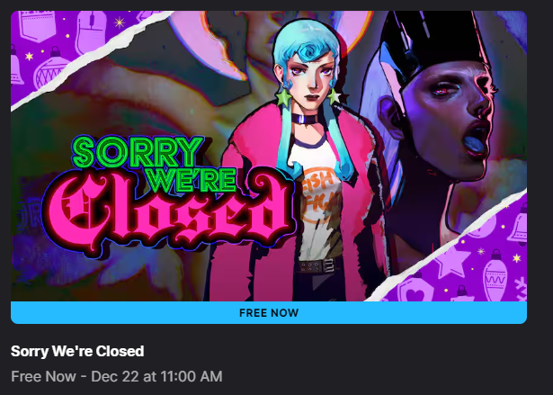 >>729010886>Sorry We're Closed is a nostalgic, single-player survival horror game with rich lore, deep characters and multiple endings. Fight in first person with demonic weapons. Open your Third Eye to see between worlds, uncover secrets and solve puzzles.