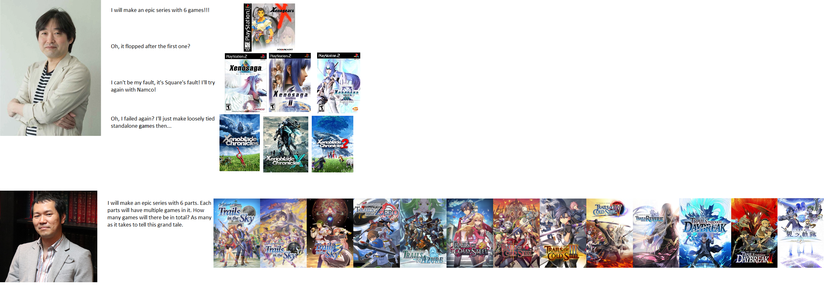 >Find out about JRPG series>It has like 20 entries>Intensely devoted fan community that hotly debates which is the best>Ask any one and they'll tell you the series is incredible>They praise the story, gameplay and world design>You buy whichever game is broadly considered a good starting point>It's complete shit>PS2 graphics>Animations that are a single keyframe>Shadows? What are shadows? >Main guy's personality: Jacket>Main girl's personality: Miniskirt>Gameplay isn't deep, it's just stupidly explained and cumbersome>TEXT TEXT TEXT TEXT TEXT TEXT TEXT TEXT *go to next NPC* TEXT TEXT TEXT TEXT TEXT>Music is good but nothing you haven't heard before>Yep, this one has an annoying animal/dragon companion too