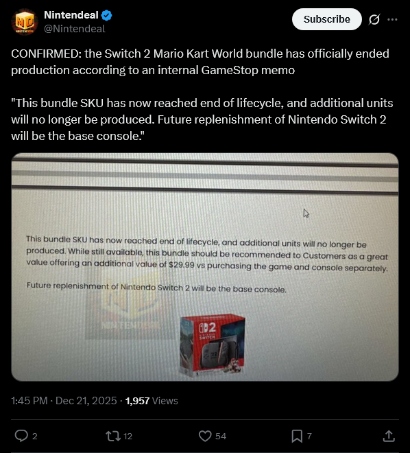 Nintendo is discontinuing the Mario Kart World Switch 2 bundle.They'll probably replace it with a new game like Pokemon.