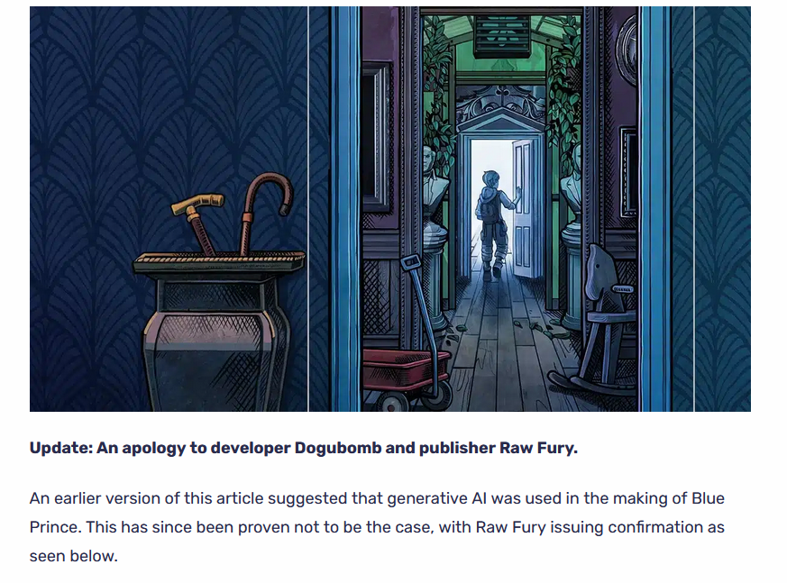 https://www.escapistmagazine.com/news-indie-game-awards-clair-obscur/>Update: An apology to developer Dogubomb and publisher Raw Fury.>An earlier version of this article suggested that generative AI was used in the making of Blue Prince. This has since been proven not to be the case, with Raw Fury issuing confirmation as seen below.https://bsky.app/profile/rawfury.bsky.social/post/3maivmd5kps2wBoy must they have red on their face, there.