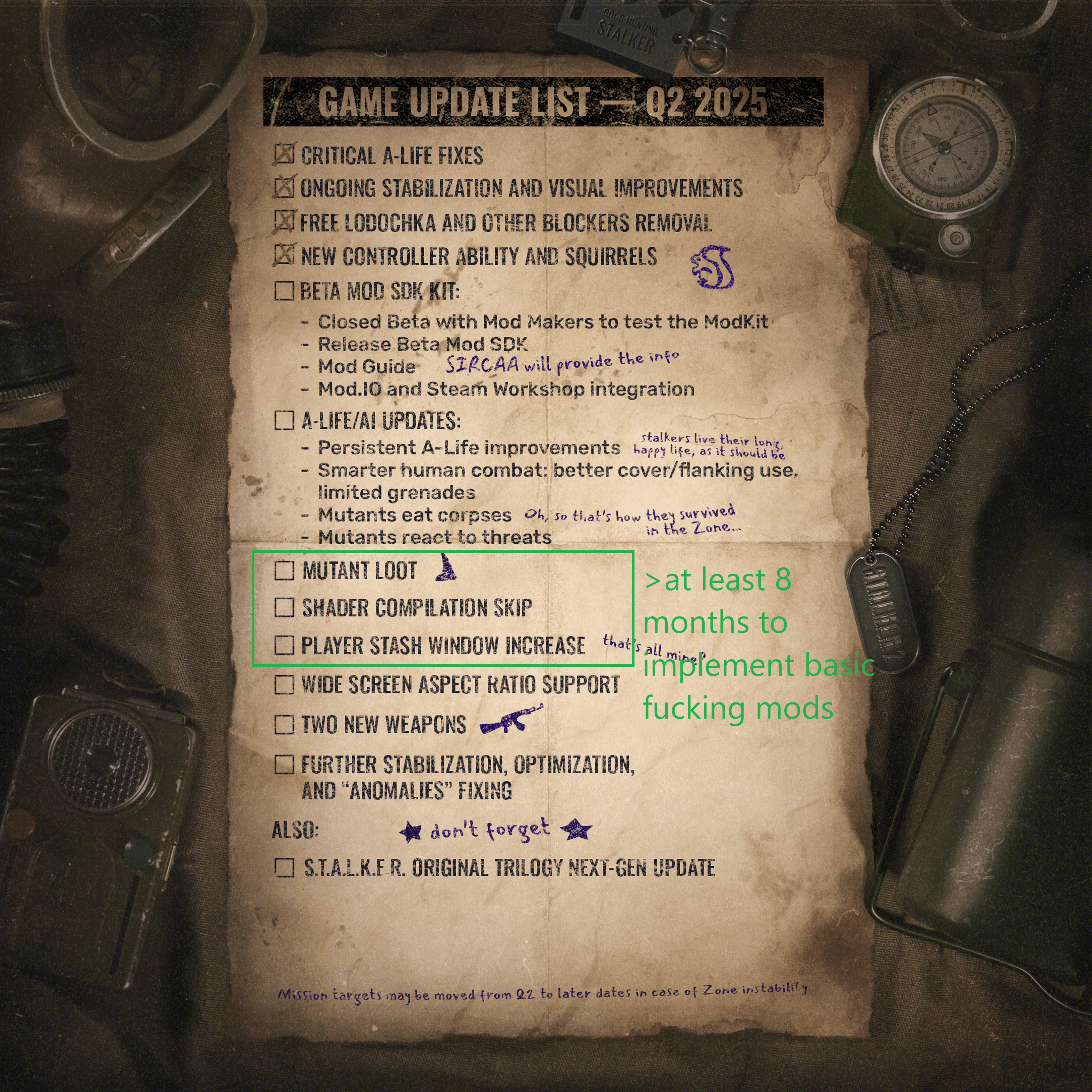 >>729039328Binocs. A-Life. Soul. Stable graphics and performance.Here's the shit they've been working on a YEAR after the initial release.