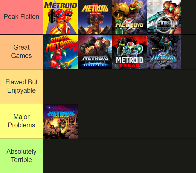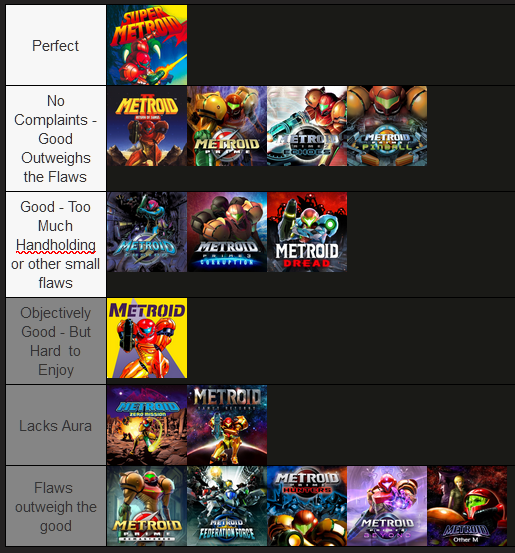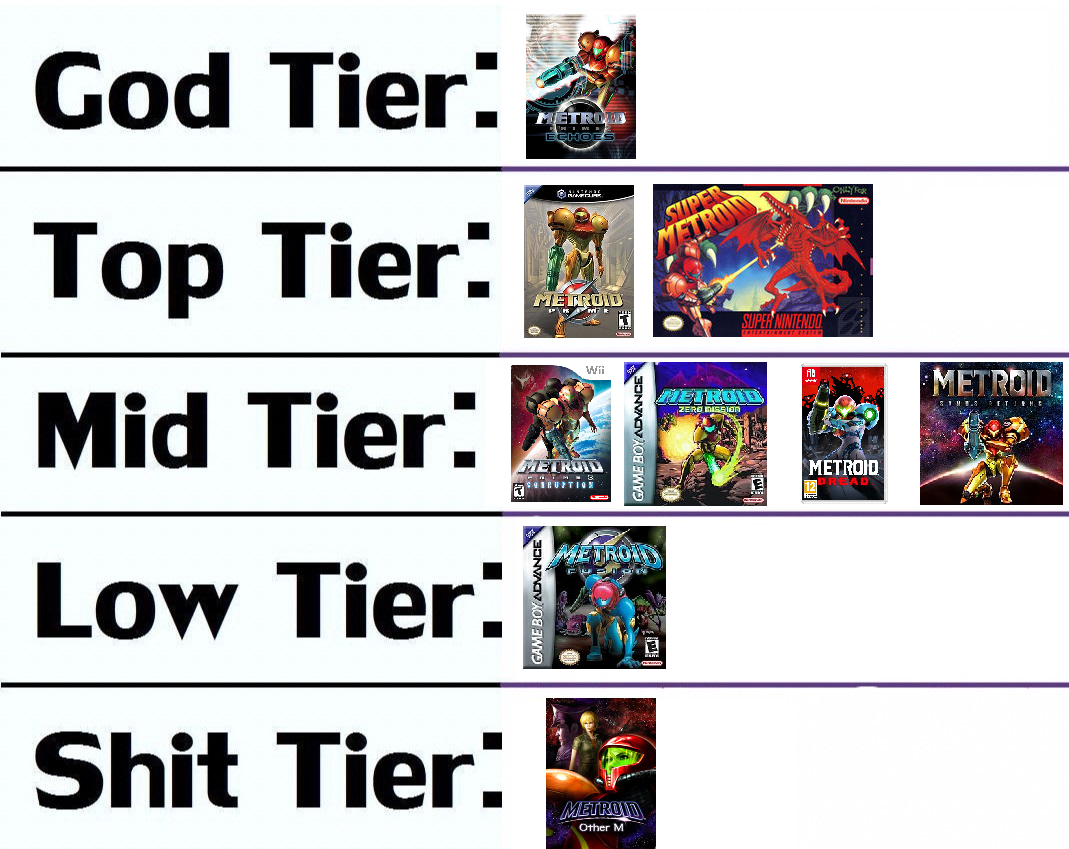 >High series standardMetroid Prime 1, Metroid Prime 2, Metroid Dread, Super Metroid>I liked itMetroid Fusion, Zero Mission, Samus Return>Tolerable but not my favorite or least favoriteMetroid Prime 3>Dated aka did not age wellMetroid 2, Metroid Prime Hunters>Bad Metroid Other M>Failed game school design dogshit Reddit awardMetroid Prime 4