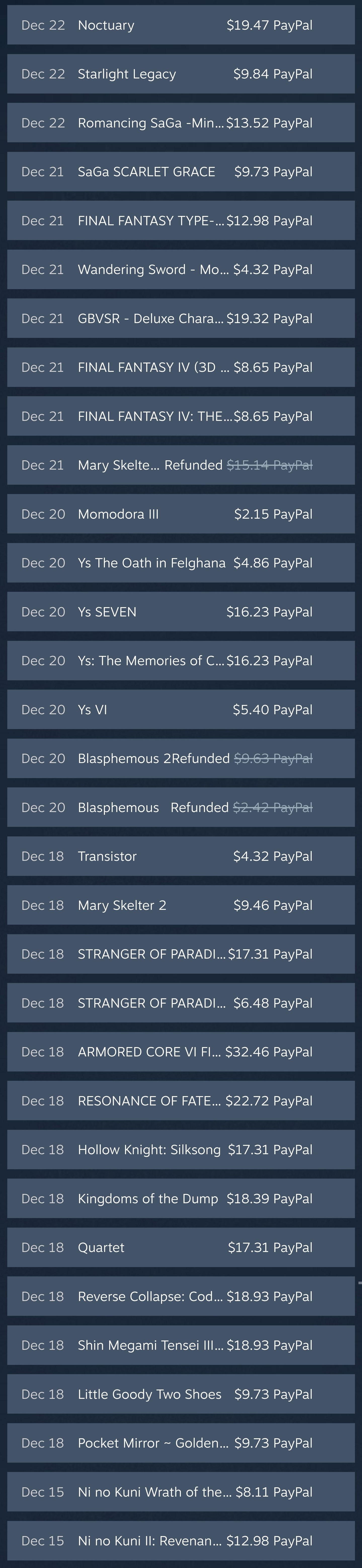 >>729117221I was only gonna buy HOI4 and the 3 'must have' DLCs and ended up getting everything but the new one, and i got a couple of Vicky3 and CK3 DLCs, fucking Paradox owns my ass.Got the X4 bundle with Endless Legend 2, Terra Invicta and Old World, EL2 is so fucking good!Also Megabonk, Cloverpit, Hexarchy, Witchfire and Elminage, Cardboard Town, BallxPit, the Royalty DLC for Rimworld and Song Of Syx.Its so fucking over for me...oh and i'm seriously thinking of getting Raidou Remastered and living on ramen cups for the next two months, just like in muh japanese animus.