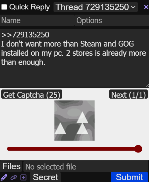 >>729135250I don't want more than Steam and GOG installed on my pc. 2 stores is already more than enough.