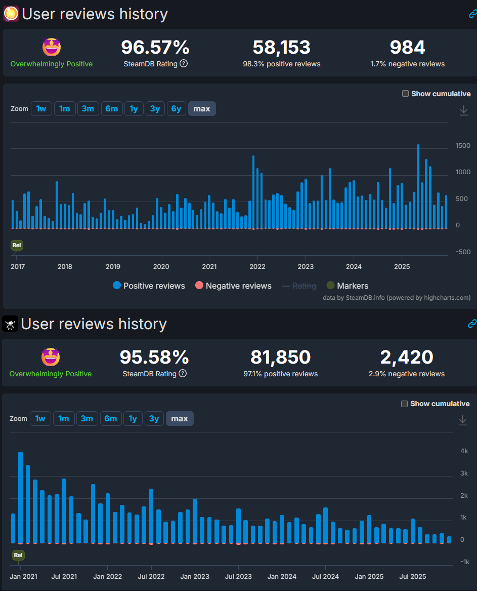 While it hasn't reached the same level of popularity (it doesn't have the same kind of characters that lead to the autistic fixation that fuels those two games discussion), if you look at the data it actually sells roughly more each year than the last year, a crazy thing in a medium where it feels like things get forgotten in a few weeks. Compared here to Omori to show a more natural "big hit then fade". Soulful game, popular with real humans not social media addicted hype slaves. Actually at this rate just by review numbers it will surpass Omori in a few years but again, not really a "discuss online forever" kind of game so don't expect to see clear signs.