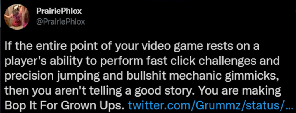 >>729167217>gameplay is the storyOne of the smartest things ever said on /v/However, it does not follow that more interactivity (or higher difficulty) is therefore automatically better. The question is, is it in service of the theme?