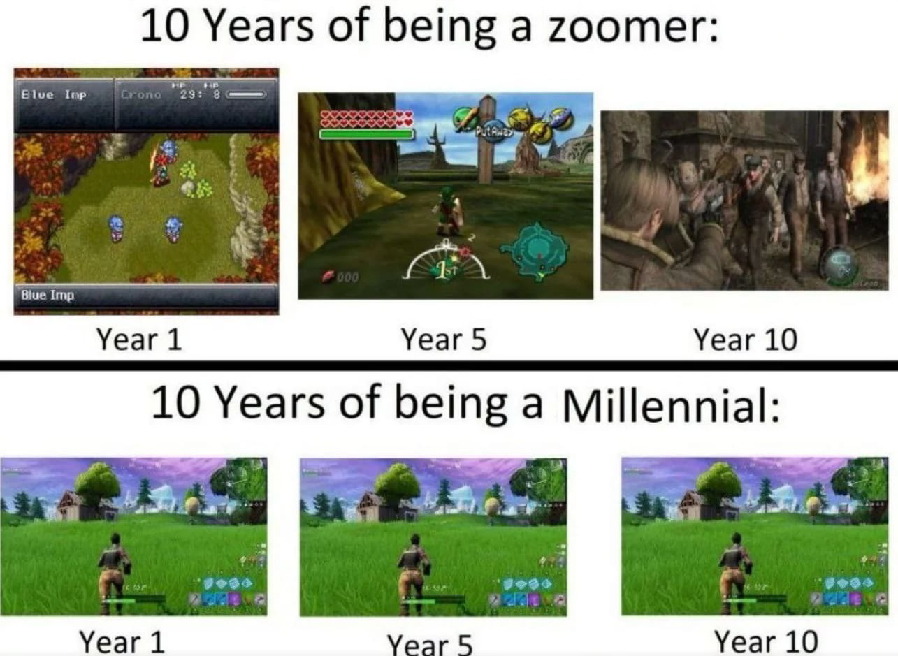 >>729168397I've seen plenty of millennials playing nothing but world of warcraft, league of legends or call of duty for 20 years. people have shit taste no matter their age