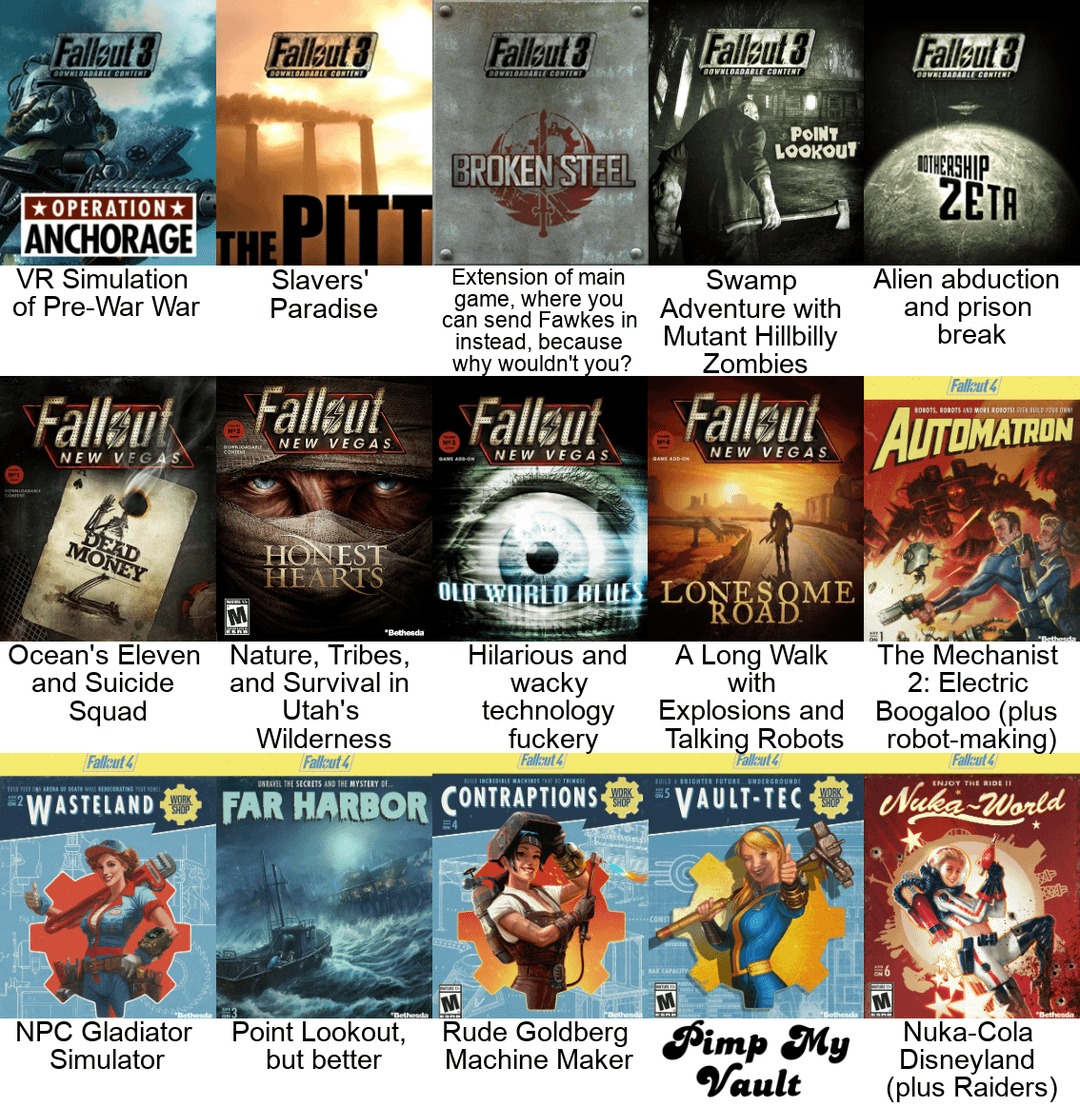 >>729182961Fallout DLC is always bad because they're not treated as extensions of the base game. They are simply self contained theme parks(and often linear) that you fuck around in, then return to the base game with extremely OP gear. Ironically, the best DLCs are the ones that add very little, like GRA or Automaton. All of the Fallout games have this issue in regards to their new location DLCs.The base game is infinitely beter.