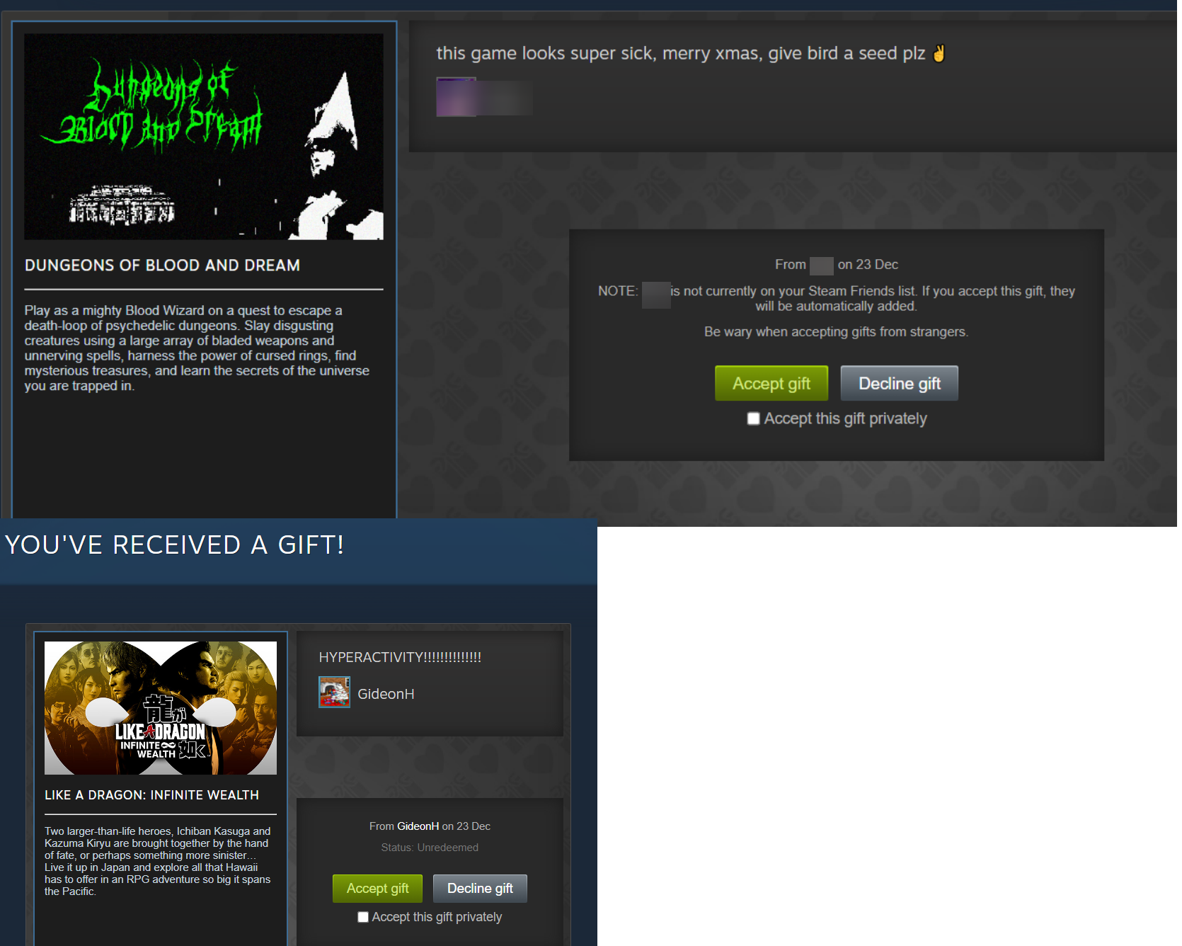 I might gift you something even if you don't gift me, but only in January. If I feel like it.https://steamcommunity.com/profiles/76561199889512987/https://store.steampowered.com/wishlist/profiles/76561199889512987/