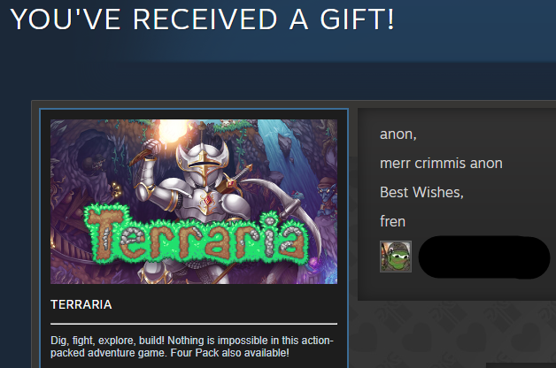 Last time I added someone from /v/ they started adding all my friends and messaging them about sexual shit, so I don't trust any of you with gifts now.