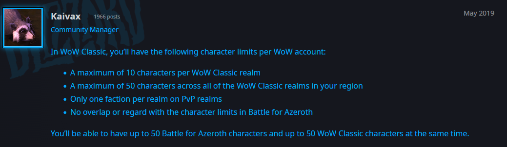 >>729196382>>PS: Characters per account is approximately 1.no, you could have up to 50 classic characters per account at launch, probably something like 10 per server