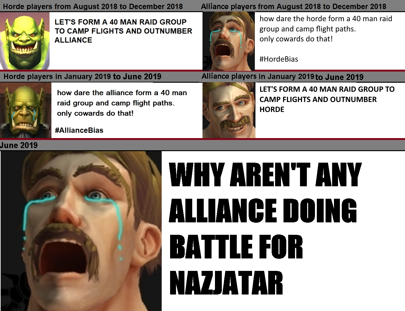 >>729200335This image is especially funny because a few weeks after Alliance were getting thoroughly assbeaten someone had the genius idea to gather ~5 people, split them into several groups that then would ALL be listed in the party finder. Poor Hordelets got obliterated from sheer numbers alone, which in turn caused more and more Alliance to join in for the free rewards.This is all to say the OP is a retard and his plan doesn't work. Your average MMO player doesn't want to PvP unless they can absolutely decimate the other side.>>72920051090% of the world being irrelevant isn't the big deal you think it is when you have a steady stream of new players. In fact it's better because new players don't have to compete with some level capped raider stealing their mobs or materials.Something you would know if you spend more time thinking about your shitty ideas than reposting the same dumbass thread.