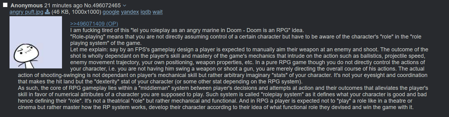 >>729194293Do you feel apart of the world the same way you would if you were reading a book? So much you feel sadness close to the end because you know it's time to wake up? Then it's an rpg.