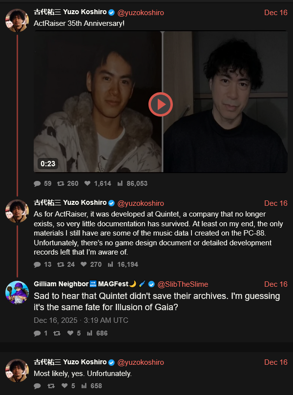 >>729206010>Act Raiser source code and artifacts gone>Illusion of Gaia source code and artifacts *most likely* goneThis does not bode well for Terranigma...