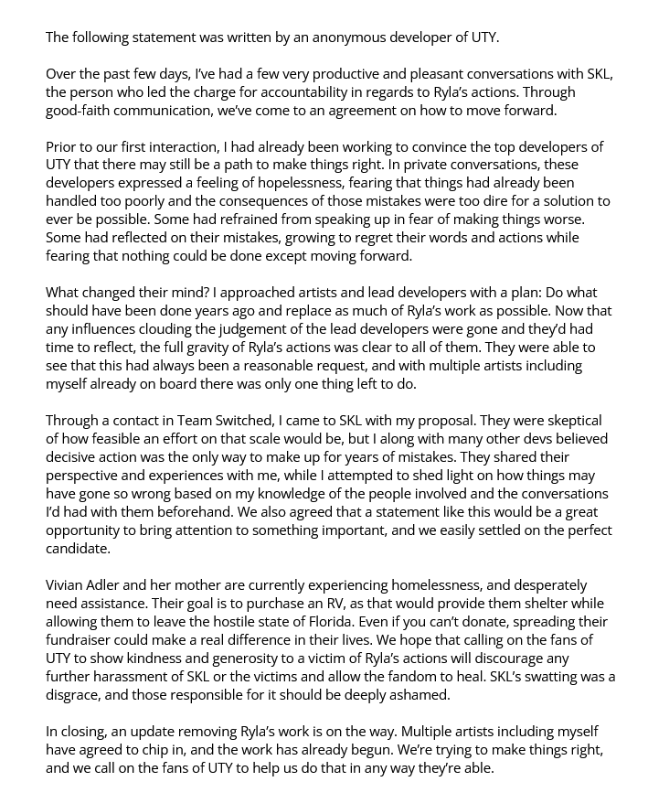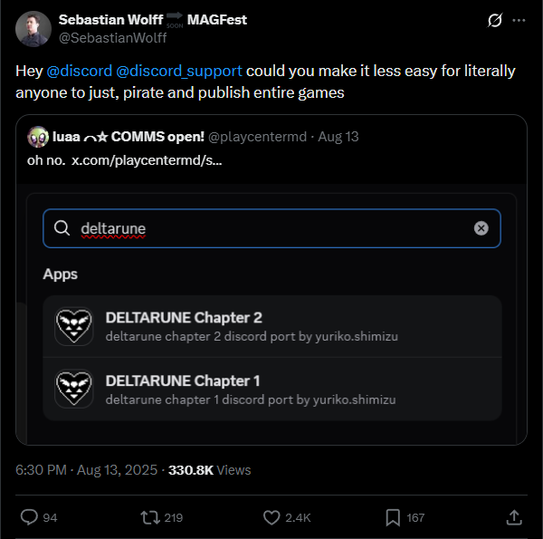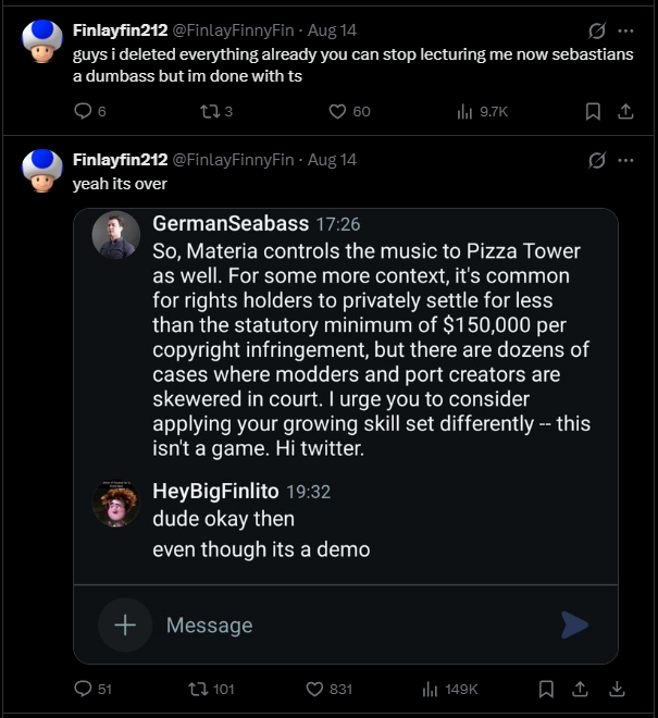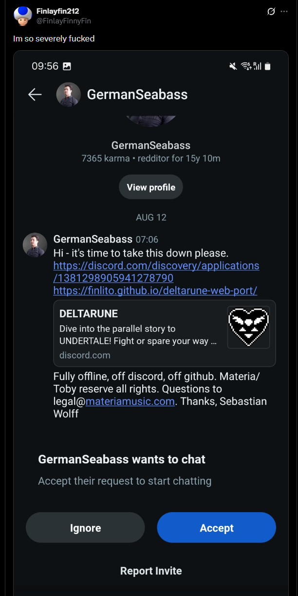 >>729247116>someone literally ports the first two chapter of deltarune onto discord>sebastian messages the creator on reddit>creator posts screenshot of this expecting to get support>people realize that sebastian directly handles ALL of toby's copyright business, not just music, thus meaning he very likely directly sent him out>this means you're arguing against toby fox's right to not have his game ported over to discord>chaos ensues