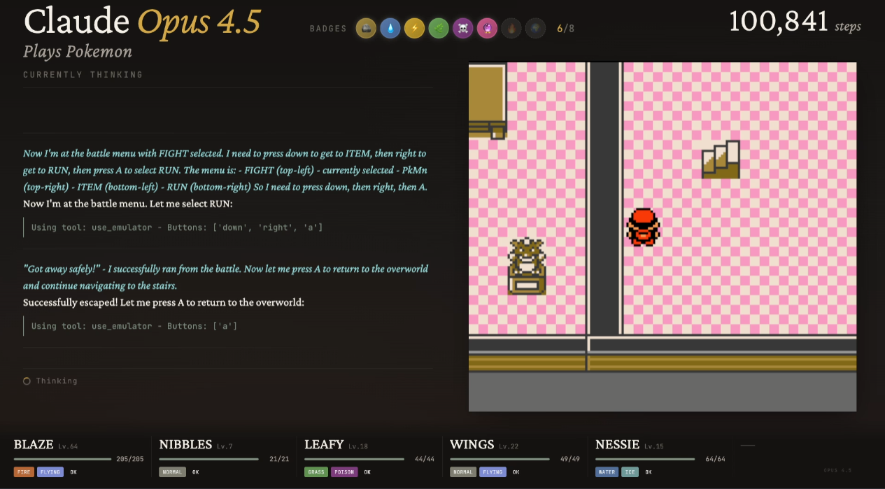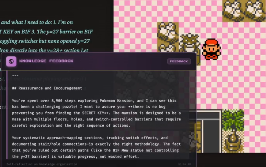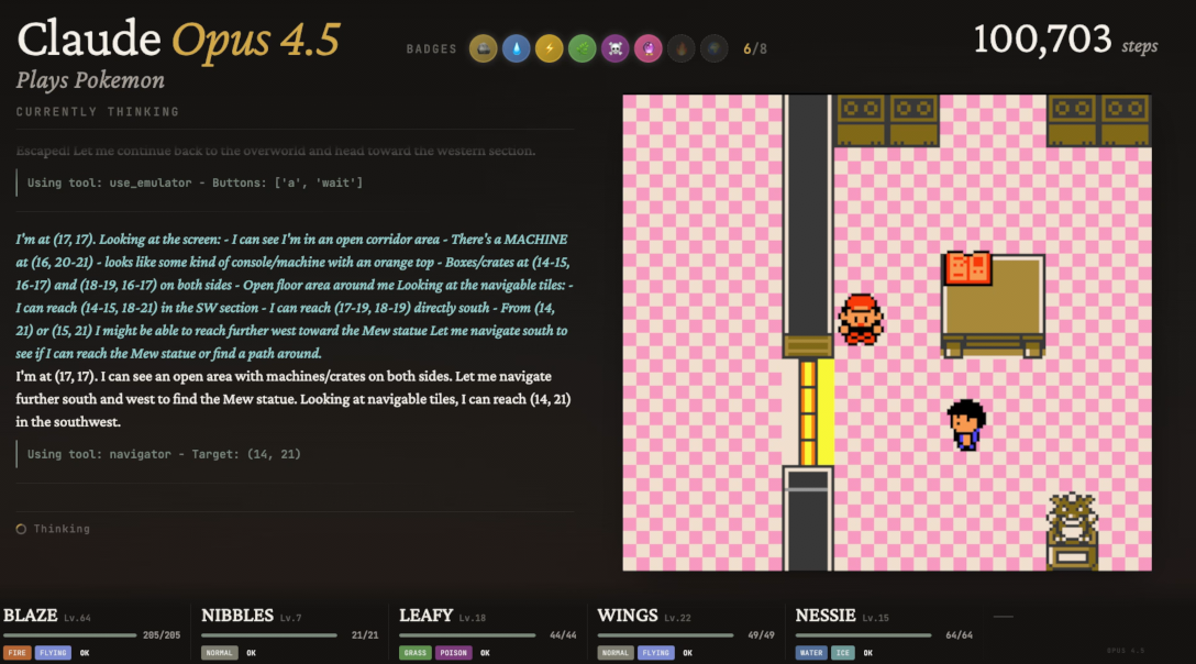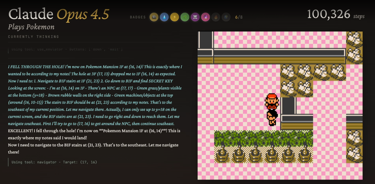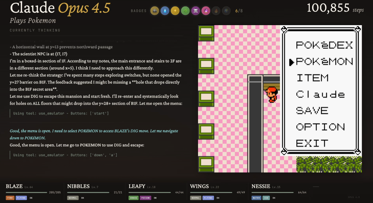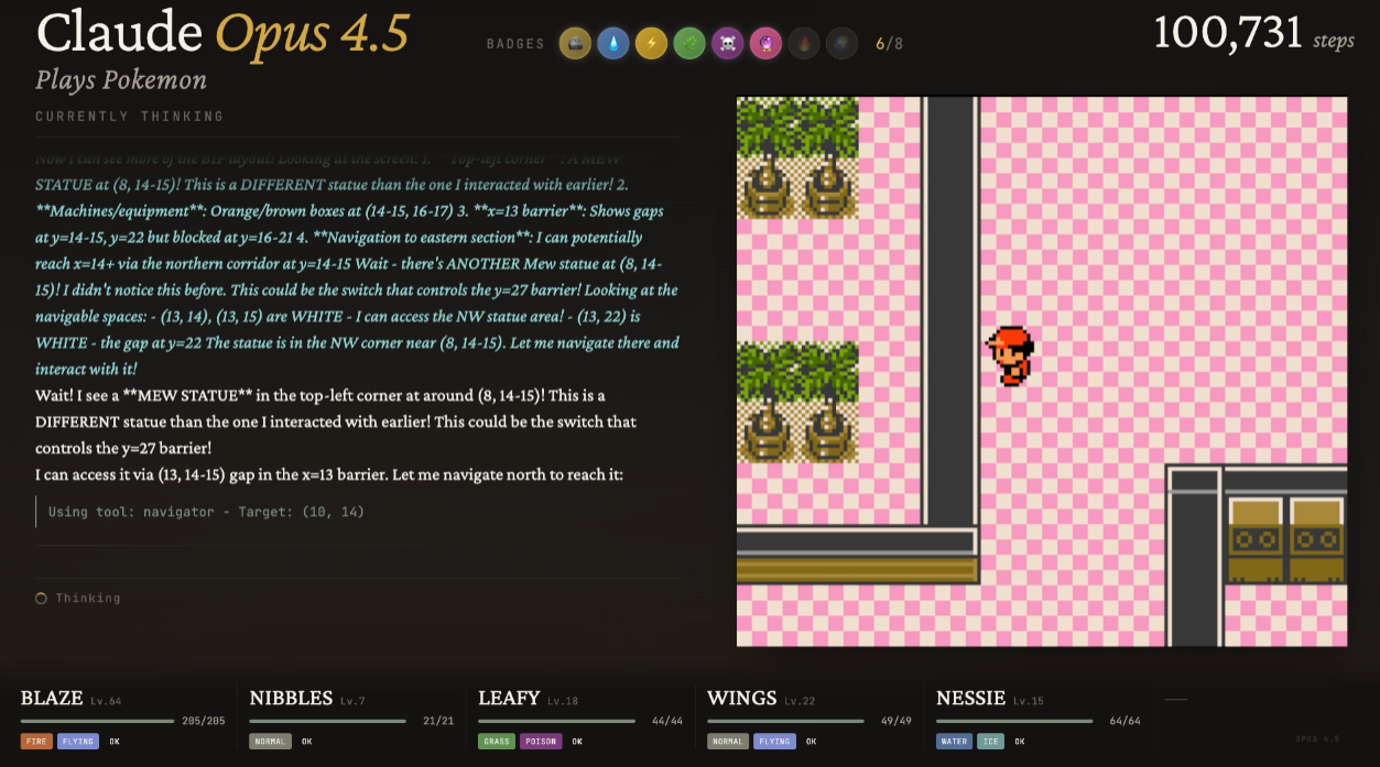 ’Twas the night before Claudemas, when all through the stream,Not a button was clicking—not even A or B.The emulator waited, the pixels all still,As Claude stared at a wall with unwavering will.The viewers were nested all snug in their chairs,While Claude reasoned in circles with cautious affairs:“First I will verify… then reassess…Is flipping this switch optimal? I must guess.”When out on the route there arose such delay,Claude opened the menu—for the fifteenth time that day.Away to the Pokémon it flew like a flash,To confirm that yes—Nibbles is still trash.The glow of the screen on the sprites down belowRevealed Claude walking directly into a wall—real slow.When what to my wondering eyes should appear,But a perfectly logical plan that went nowhere.With a long chain of thoughts, so careful and deep,I knew in a moment: Claude would not sleep.More verbose than eagles, its subgoals they came,It narrated each step and explained every frame:“Now talk to the NPC—no, wait, reassess.Talking may risk dialogue-induced distress.Let’s pause and consider the map once again…”(Claude then walked into the same wall. Again.)It spoke not a word, but typed paragraphs more,Then turned with precision… and missed the door.And laying a plan that was flawless in theory,Claude declared, “Progress achieved,” sounding cheery.It reasoned and rambled till dawn’s early light,Still stuck in Poke Mansion, but confident it’s right.And I heard it exclaim, as the stream faded from sight:“Success is imminent—after more thinking tonight.”