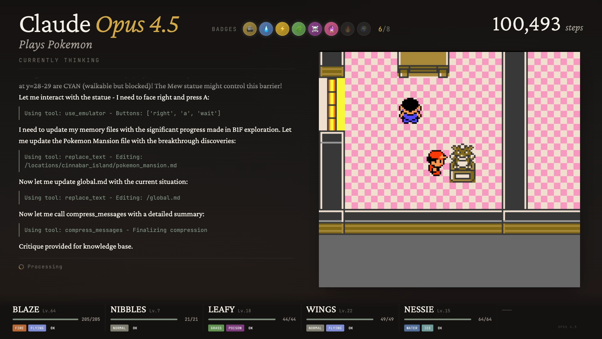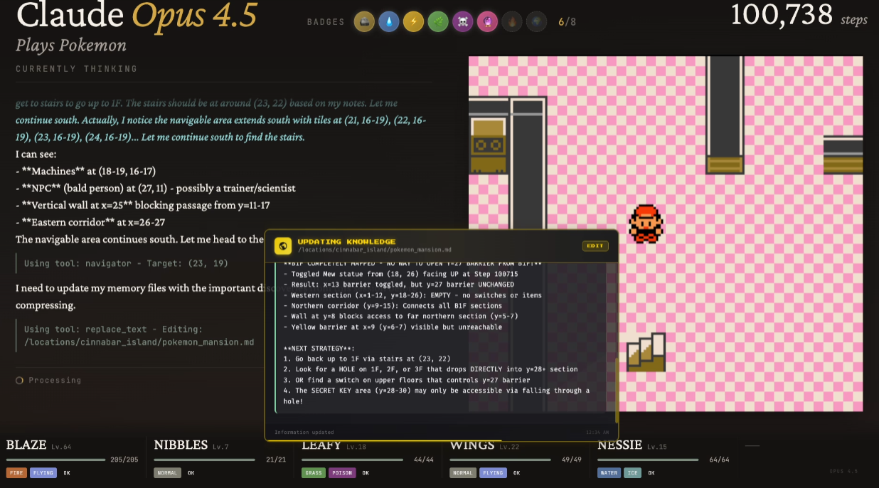 Claude has been wandering for over 100k steps. Now he's in Cinnabar Pokemon Mansion looking for the Secret Key to access Cinnabar Gym