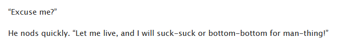 >>729300213I can't find the exact lines but this made me chuckle.>Heavy Ogryn: "Look, Oim smiling.">Outlaw Scum: Nervously "That's not a smile...">Heavy Ogryn: "Yes it is, you can see my teeth."The delivery was pretty good.