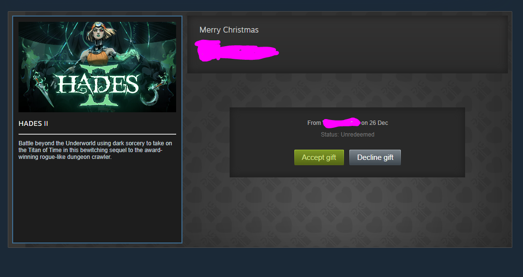 I was already gifted but if you have Legacy of Kain Soul Reaver 1&2 Remastered or Atomic Heart I would love it! Merry Christmas!https://steamcommunity.com/profiles/76561199794790779/
