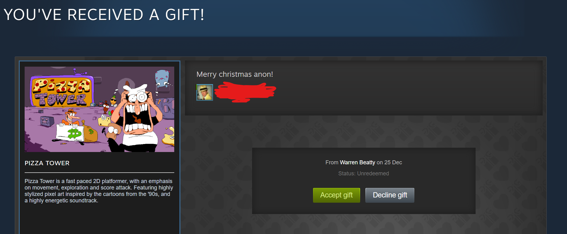 https://steamcommunity.com/id/styx_the_lone_trooper/for this Christmas I want Helldivers 2 because I live in Russia and I can't buy it here due to regional restrictions. Thanks, Sony.This year I played Quasimorph, Elin, Jagged Alliance 2 (not wildfire), Witchfire and old Westwood RTS titles.