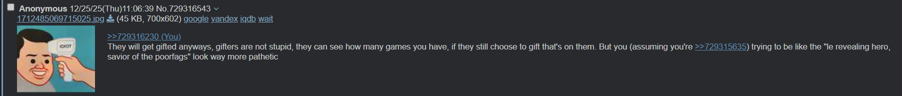 >>729314928>I wanna gift to only poorfags with less than 100 games!>gifts to an alt who doxes youI told you so