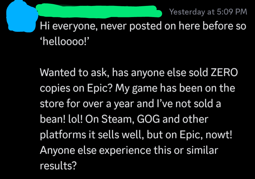 Epic is too sanitized. If you say something even remotely offensive you get banned. You don’t get to customize your profiles, and your profile name has to family friendly and corporate friendly. The launcher is a piece of shit. Steam had a lot going on for it, even if it could be better. It’s a different vibe. Using steam feels like using a video game platform. Using the Epic store feels like interacting with a corporation. I know steam is a corporation too but the store doesn’t feel corporate, unlike epic.