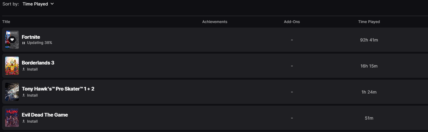 I have 54 games in my EGS library, here are the only ones with playtime in them.EGS is a software that lets me get drunk with my friends and play fortnite together and that's really it, I haven't played BL3 since the year it was free on epic.