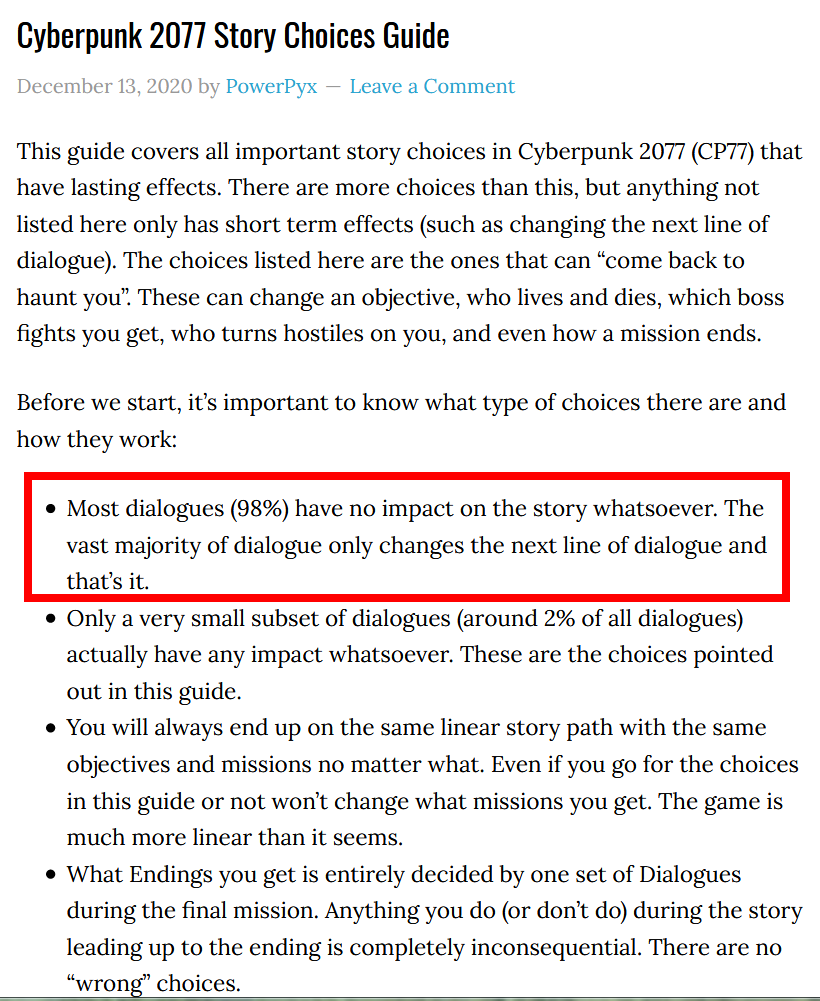 It had a short main story compared to other AAA RPG games, the DLC mostly saved it in that department. The graphics and overall aesthetics were great and the game has top 3 gameplay for an RPG-esque game, playing an endgame character geared to the max is incredibly satisfying, but unfortunately it's tacked to a very shallow world with forgettable and repetitive gigs. The best characters literally die in the beginning of the game, the rest are boring and I didn't care for them. The game wanted to be a movie so bad and it was funny watching veteran Hollywood actors effortlessly mogging the rest of the cast in cutscenes. Music was hit and miss, mostly miss. If it wasn't hyped to the heavens by everyone I think it might have been better received. It ended up being a botched UbiSoft game. It's horribly padded and bloated. I remember clearing each and every gig, side mission, some driving missions and some random encounters, and I still needed to play twice as much as I did to plat the game. The game is not THAT fun.