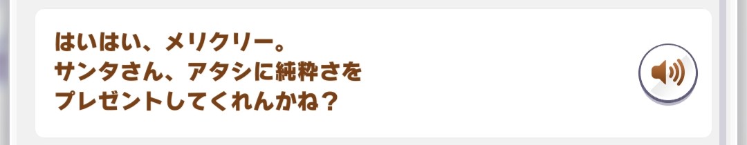 >>729344349That's impossible to translate succinctly, but basically I read that as her asking Santa for the ability to be more honest with her desires.In her career she always thinks she isn't good enough, so she tries to tell (You)/herself that merely placing is good enough. But deep down she does want to win, and she wants to stop pretending otherwise. So if I had to choose a single word for 純粋さ here it's more honesty/purity rather than innocence.