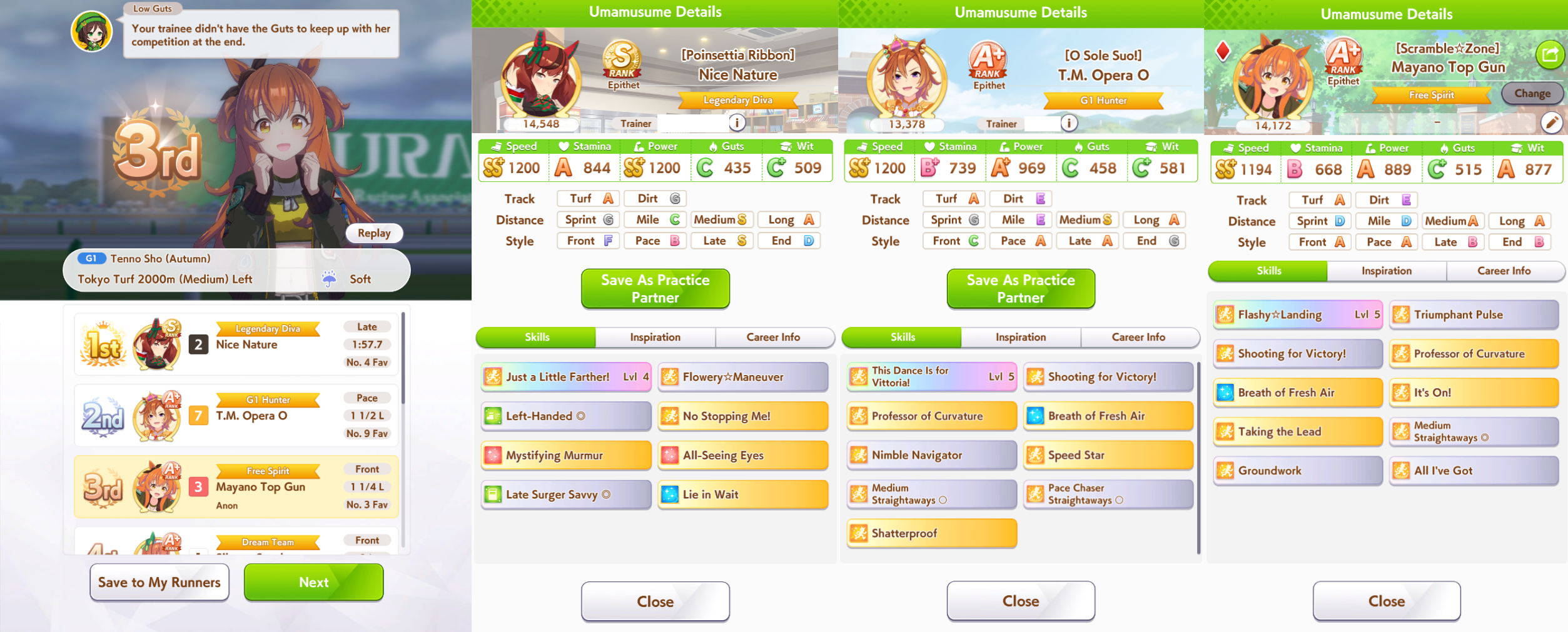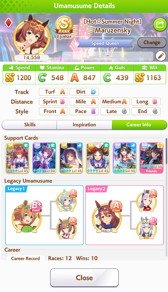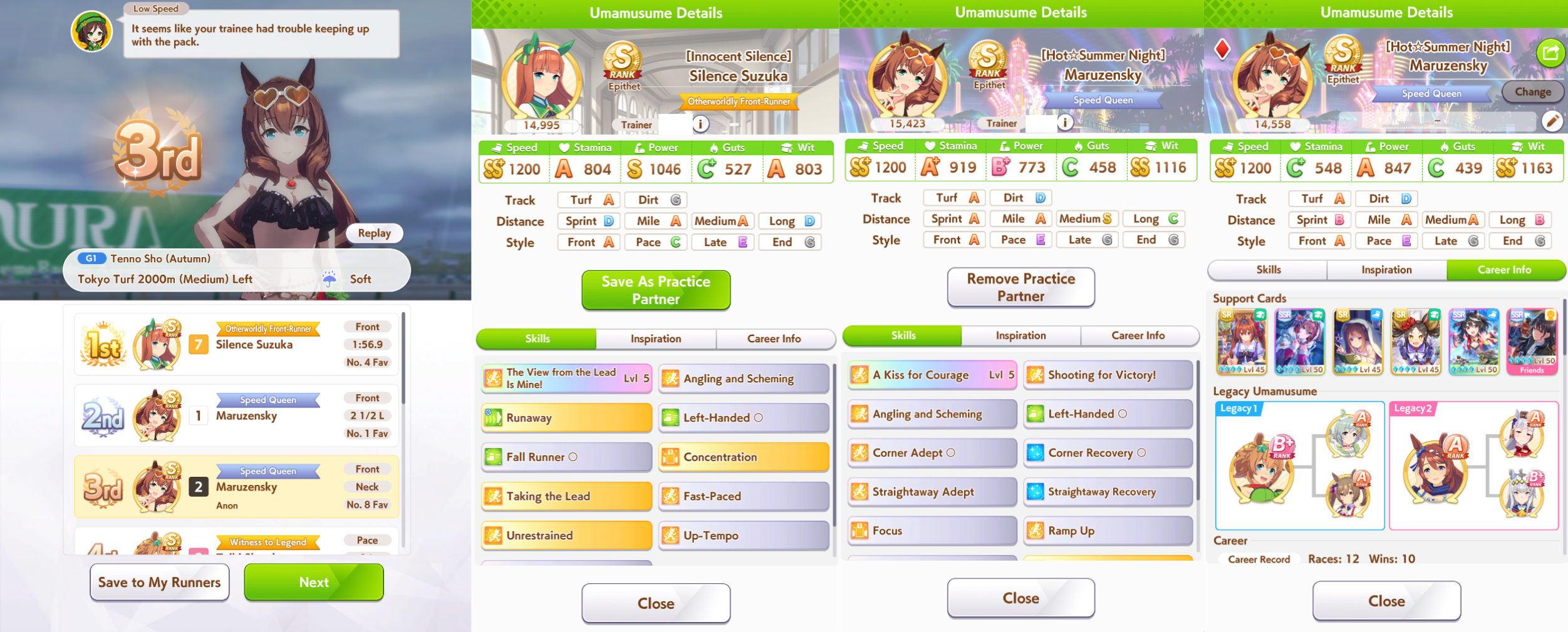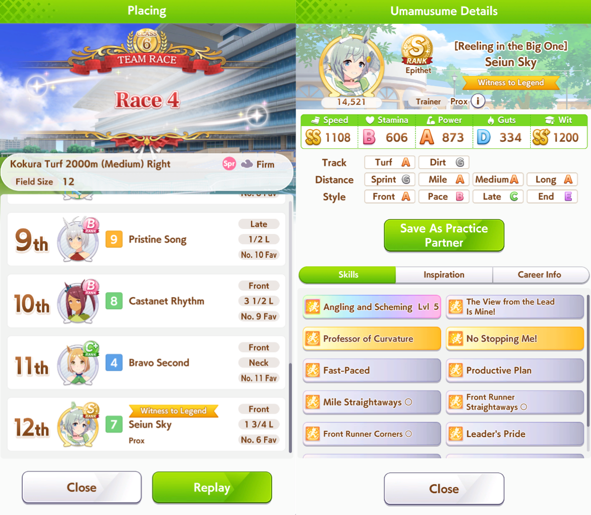 >>729346028Suzuka avoids the spot struggle and takes the win!That's all for now. Thanks for the races.>>729346140She has stronger rainbows thanks to her friendship bonus, her events are great, and I find her wit bonus a lot more useful than Tachyon's skill point bonus.My Fine Motion is LB2, and the stamina/guts you get from MLB Riko is very important for this particular build to work.