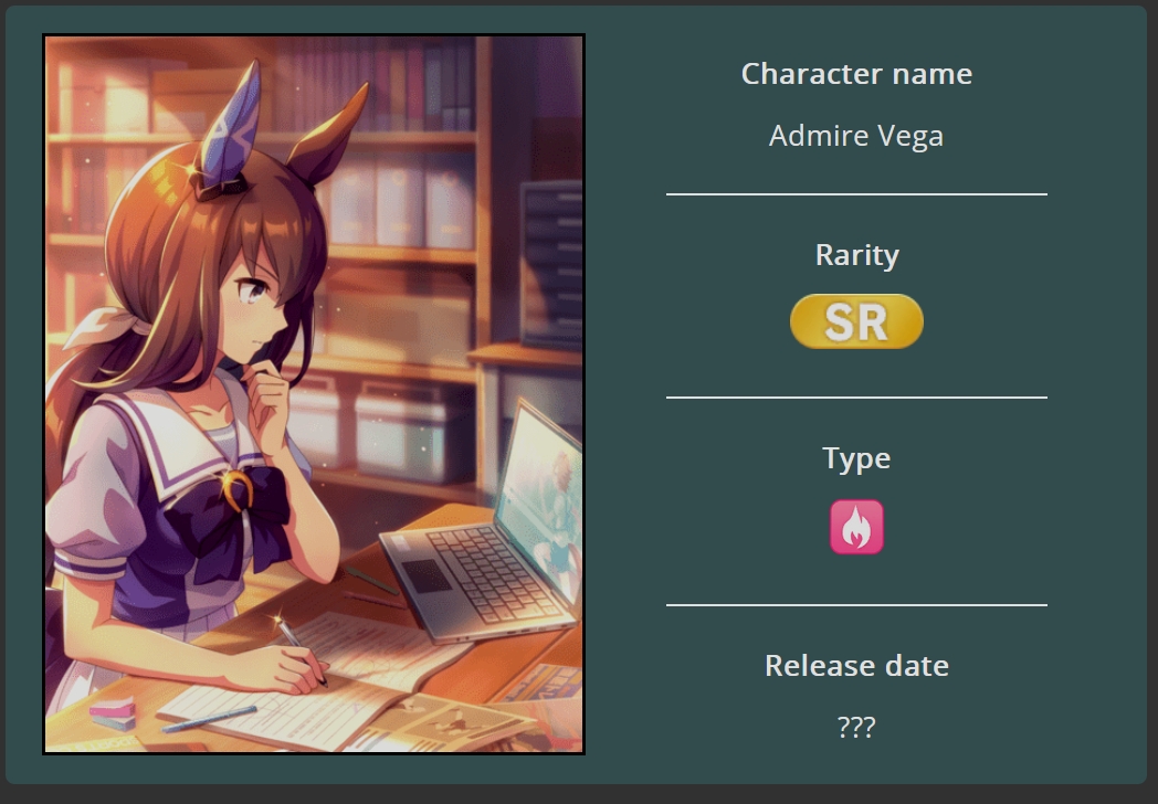 >>729332507Seriously how difficult is it to just port her exactly as she is in the anime and change her name? Shes so popular she could be a half anniversary headliner.