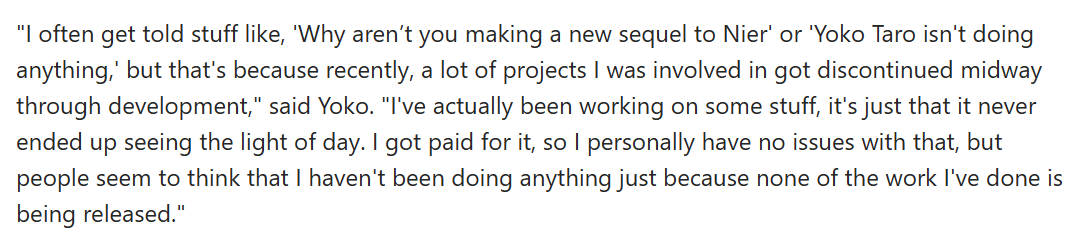 >>729328109>>729328163This is old as fuck though.I was at the Nier concert in London last year where Taro made an appearance. He pretty much confirmed that the story that he wrote for the concert (set after Ending E) was essentially leading to the next proper game in the series