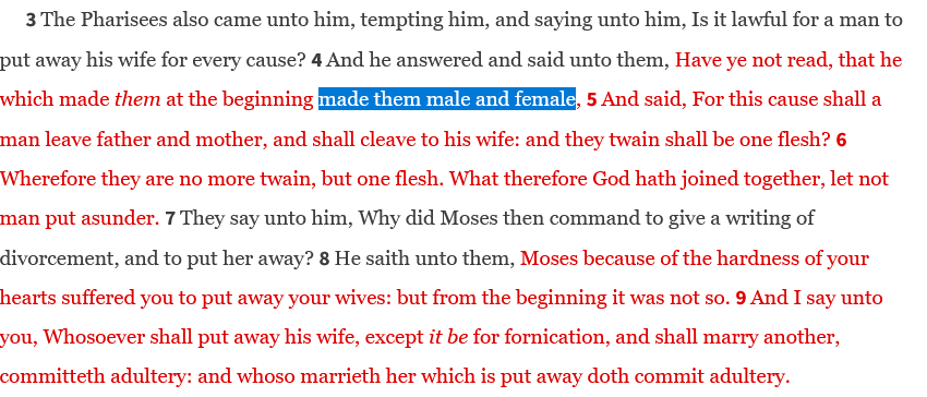 >>729348341NTA.>And I say unto you, Whosoever shall put away his wife, except it be for fornication and shall marry another, commits adultery, and whosoever marries her that is put away commits adultery.This confirms that Jesus deems fornication a sin.What's fornication, anyway?>Fornication generally refers to consensual sexual intercourse between two people who are not married to each other.Given that marriage can only be between a man and a women, he does condemn homosexual acts.Unless you think homosexual sex is not genuine sex.