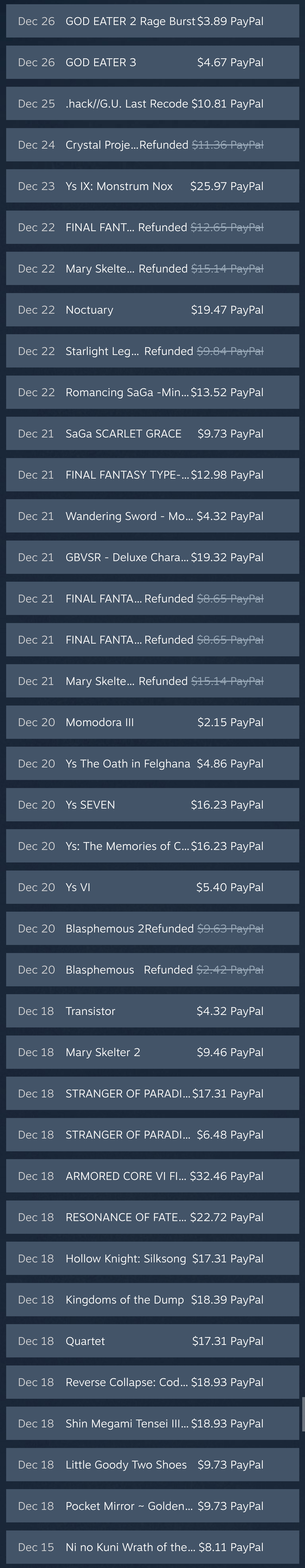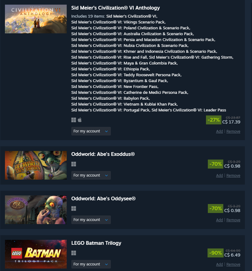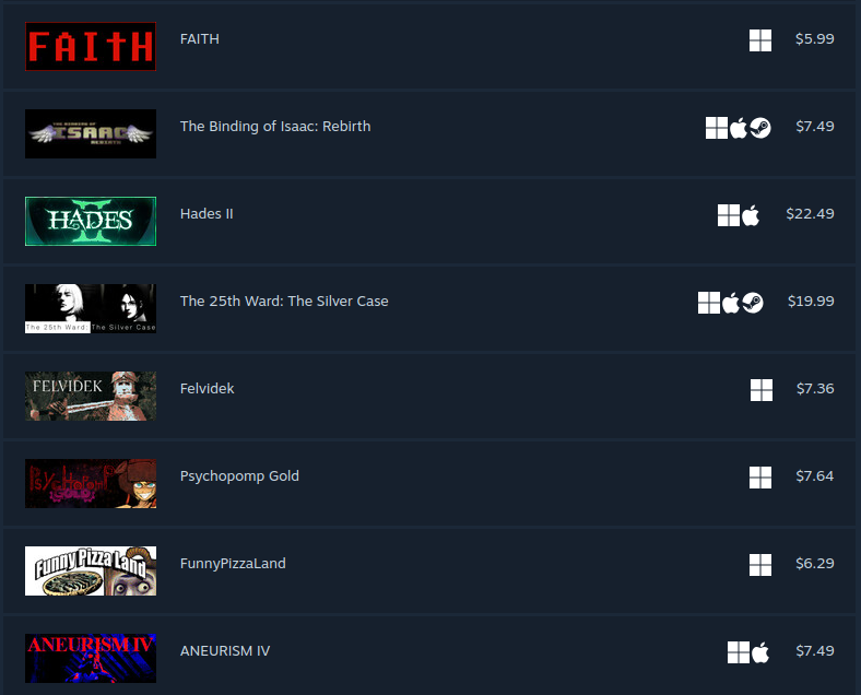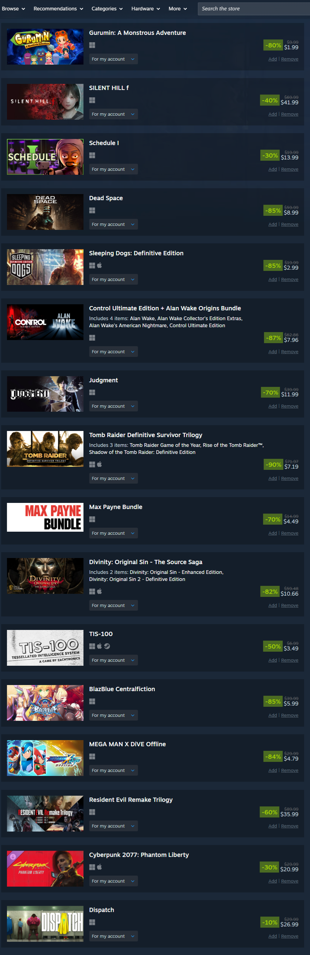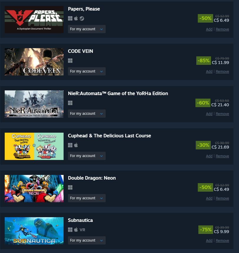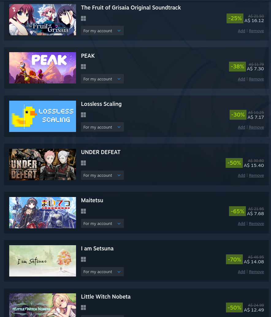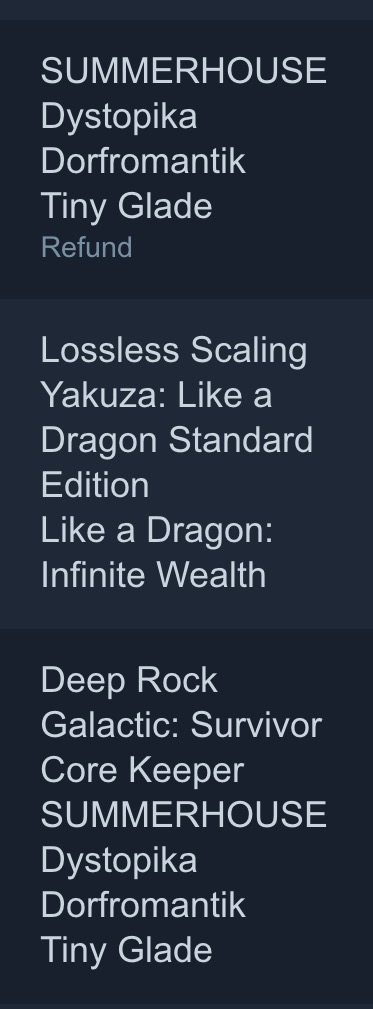 took it easy this sale and even resisted the urge to overspend on coomer games like alwaysthe middle games are getting delisted so that's why i got them